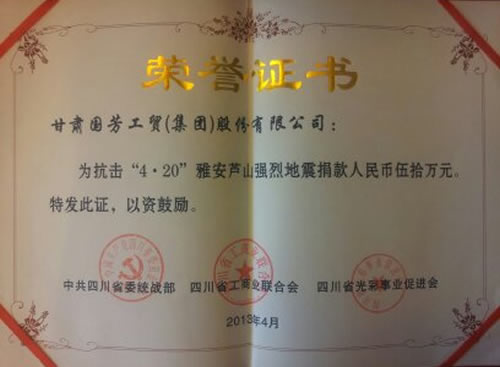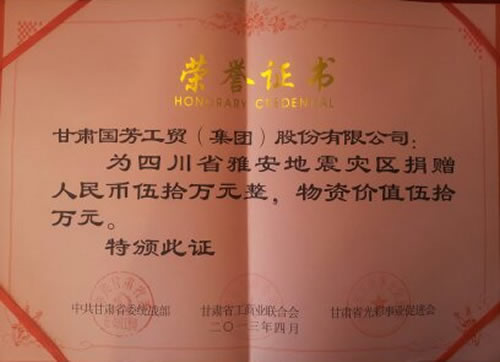 北京時間2013年4月20日8時02分,四川省雅安市蘆山縣發(fā)生7.0級大地震,作為甘肅省知名企業(yè)以及“甘肅省十大慈善單位”,國芳集團(tuán)在第一時間向災(zāi)區(qū)捐贈50萬元現(xiàn)金和50萬元的物資,向災(zāi)區(qū)群眾送去一份愛心,這一善舉得到了廣大社會輿論的好評和百姓的良好口碑,并得到了四川、甘肅兩省,省委統(tǒng)戰(zhàn)部、省工商聯(lián)、省光彩事業(yè)促進(jìn)會的表揚和嘉獎。在此國芳集團(tuán)呼吁更多的企業(yè)能夠加入社會公益、慈善的行列里來,讓社會主義大家庭的溫暖,灑向神州大地,也祝愿雅安同胞早日遠(yuǎn)離苦難,重建家園。