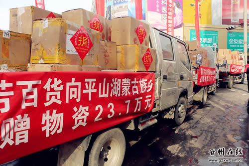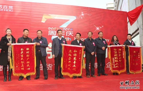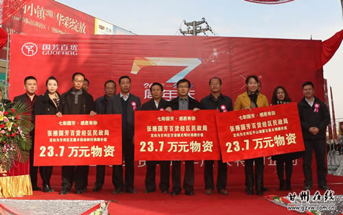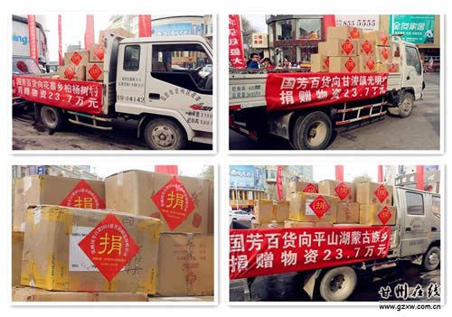11月22日上午,張掖國芳百貨公司7周年慶典之際,為我區(qū)甘浚鎮(zhèn)光明村、花寨鄉(xiāng)柏楊樹村和平山湖鄉(xiāng)困難群眾一次性捐贈了價值71萬元的物資。區(qū)委常委、常務副區(qū)長秦偉、副區(qū)長張興鋒出席了捐贈儀式。