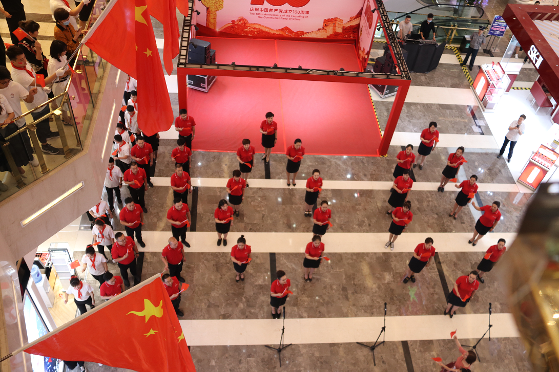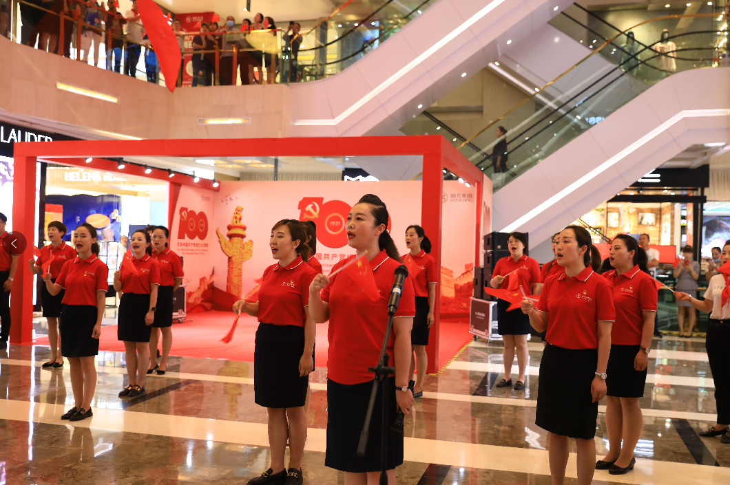 下午14時(shí),國芳集團(tuán)慶祝中國共產(chǎn)黨成立100周年紅歌快閃活動(dòng)在蘭州國芳百貨廣場店一樓中廳隆重舉行。國芳集團(tuán)全體黨員及員工代表參與其中,大家用歌聲表達(dá)對(duì)黨的無限忠誠和美好祝福。