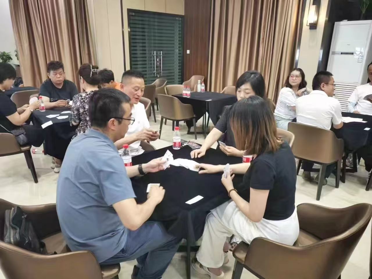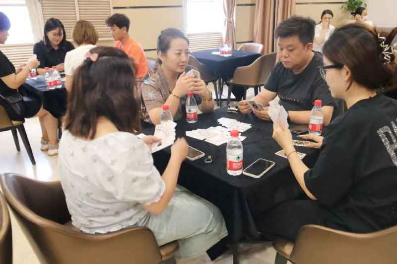 在運(yùn)動(dòng)會(huì)的摜蛋比賽現(xiàn)場(chǎng),氣氛熱烈而又緊張。一張張牌桌整齊排列,參賽選手們兩兩相對(duì)而坐,神情專注而投入。他們的目光緊緊鎖住手中的牌,大腦飛速運(yùn)轉(zhuǎn),思考著出牌策略。每一次出牌都顯得深思熟慮,又充滿了果斷和自信。
